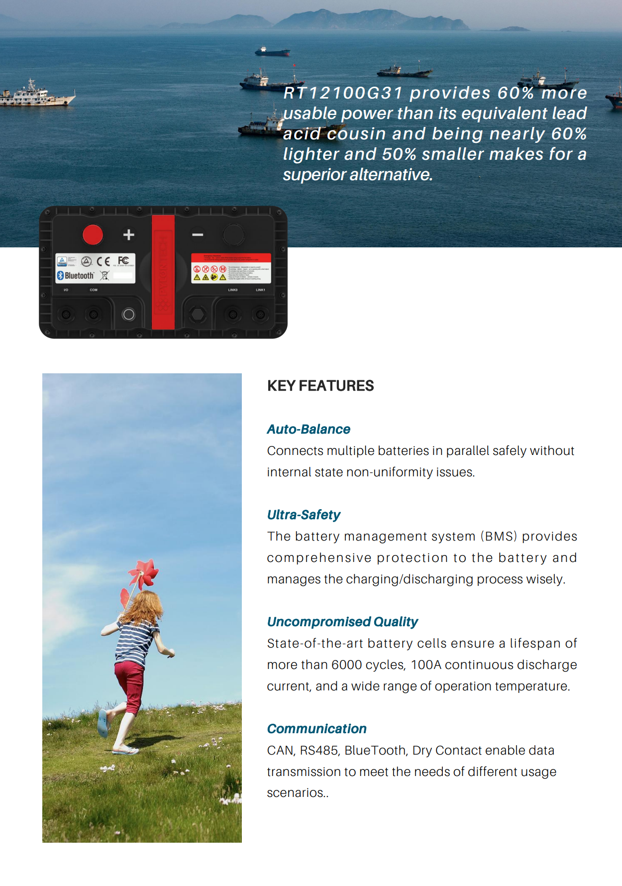Batterie scellée autochauffante à décharge profonde au lithium avec Bluetooth.