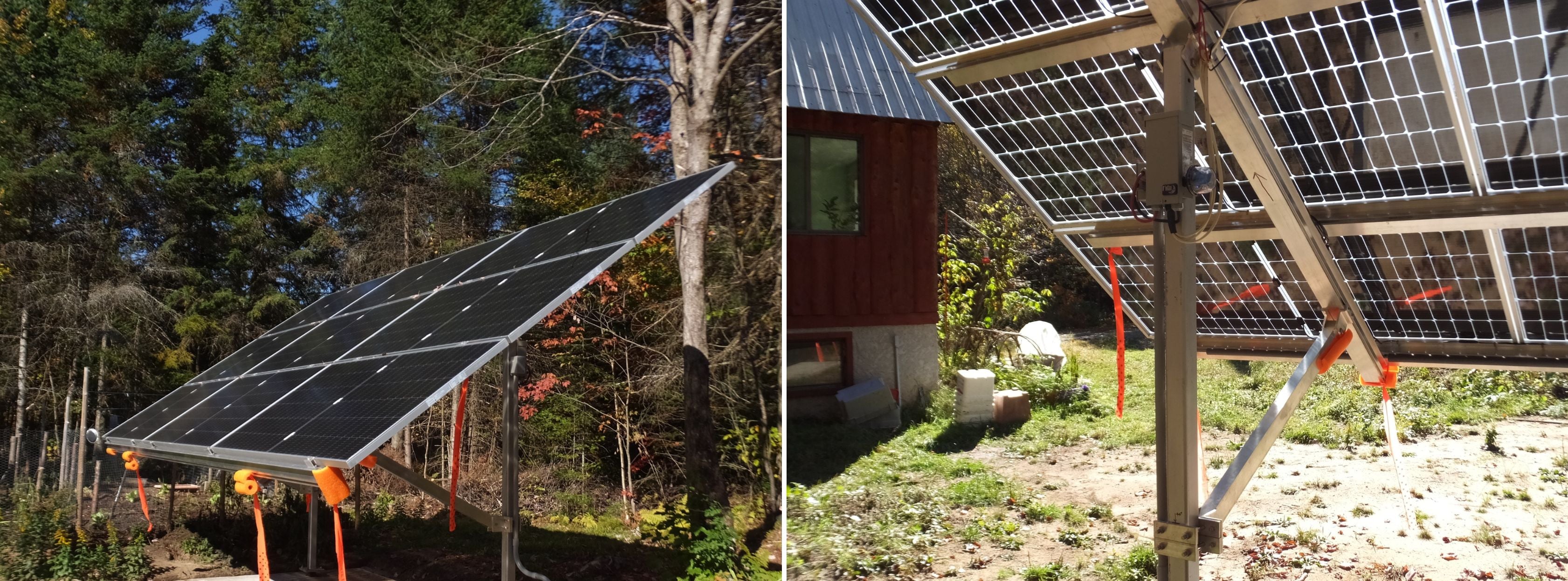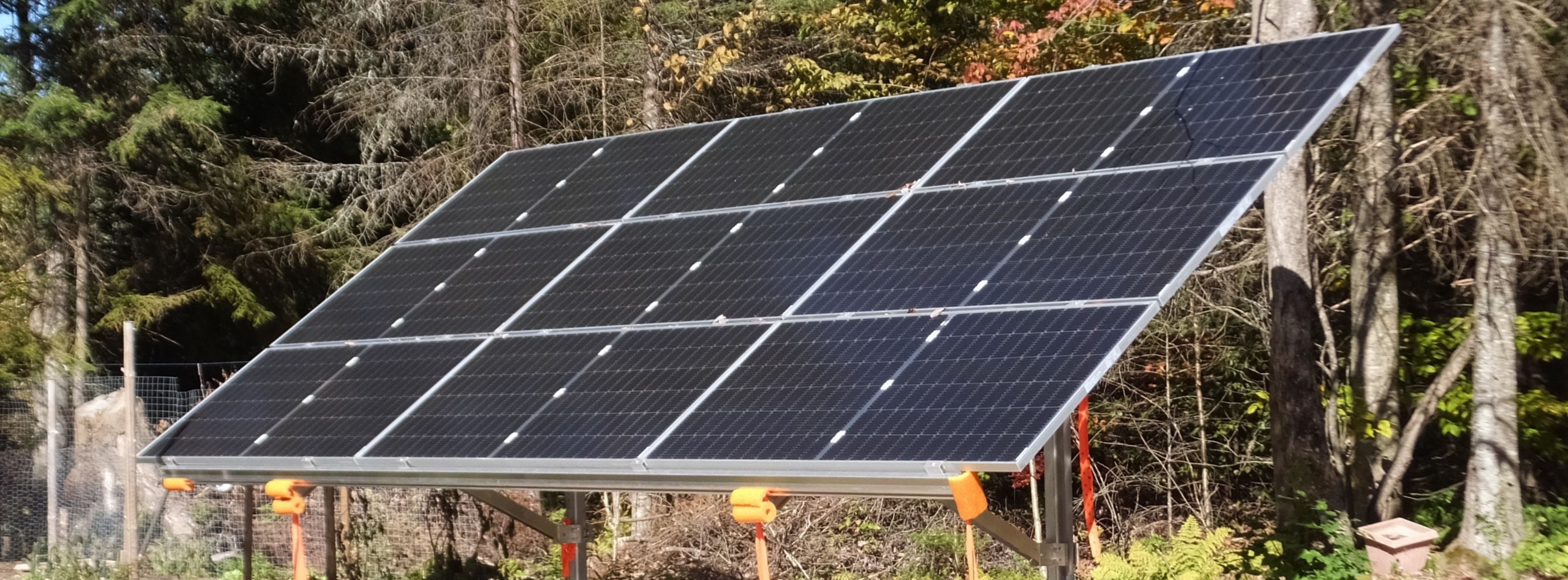Pour le réfrigérateur, suite à mon souhait d’utiliser un réfrigérateur 110 V moins coûteux et plus spacieux, il a été suggéré de choisir un appareil consommant moins de 450 kWh/an. J’ai pu trouver un 20 pieds cube consommant 387 kWh/an pour environ 1 00$. On a aussi ajouté un support au sol Opsun, entièrement fabriqué de profilé d’aluminium (extrusion). Les panneaux bifaciaux seront aussi plus efficaces en hiver. Le montage des composantes du système sur un panneau d’aluminium a aussi été inclus.