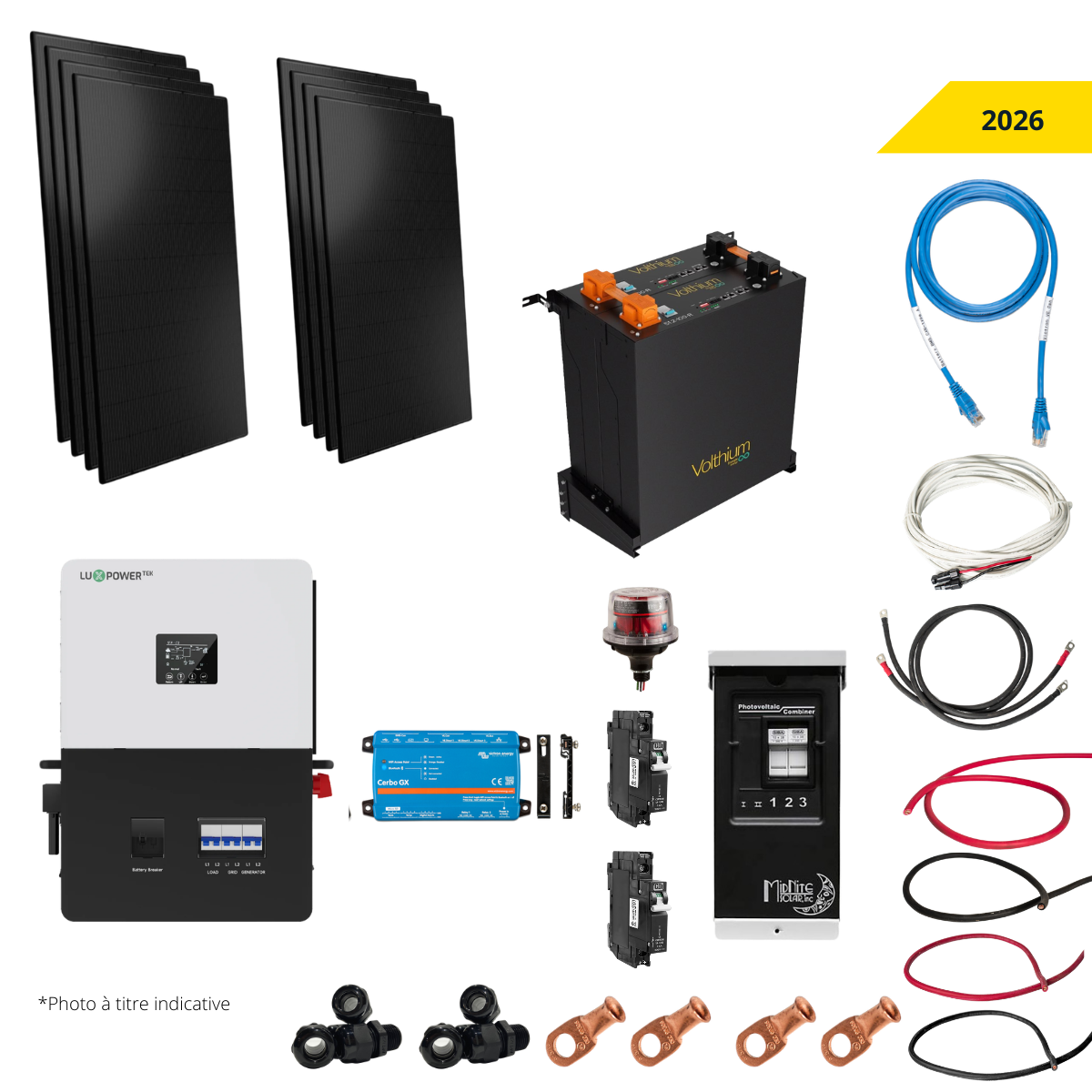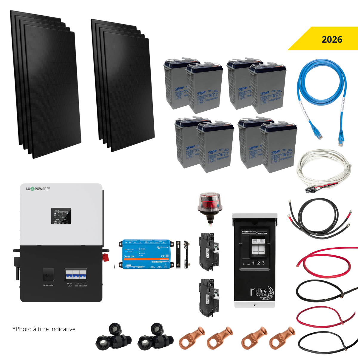 Les composantes de nos systèmes solaires sont compatibles ensemble. Toutefois, les ensembles vous sont présentés à titre indicatif seulement, nous ne pouvons garantir qu’ils répondent à vos besoins en énergie. Il est de votre responsabilité de vous assurer de la suffisance des systèmes solaires que vous vous procurez. Vous pouvez vous adresser à nos conseillers pour obtenir des informations additionnelles.