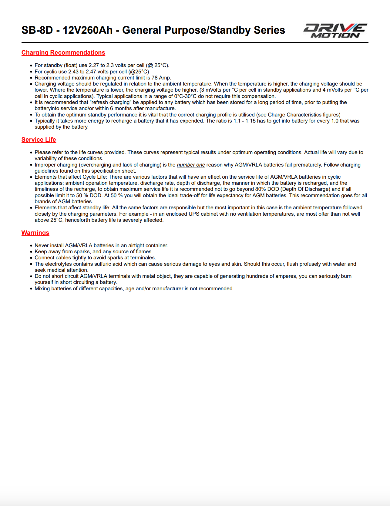 *Le nombre d'ampères utilisé par heure varie selon l'utilisation qui en est faite. Voir la fiche technique plus de détails sur le rendement en énergie.La SB8D est une batterie polyvalente qui peut garder sa charge jusqu'à 12 ans. Elle est idéale pour alimenter les systèmes de sécurité, les lumières d'urgence et les appareils médicaux.