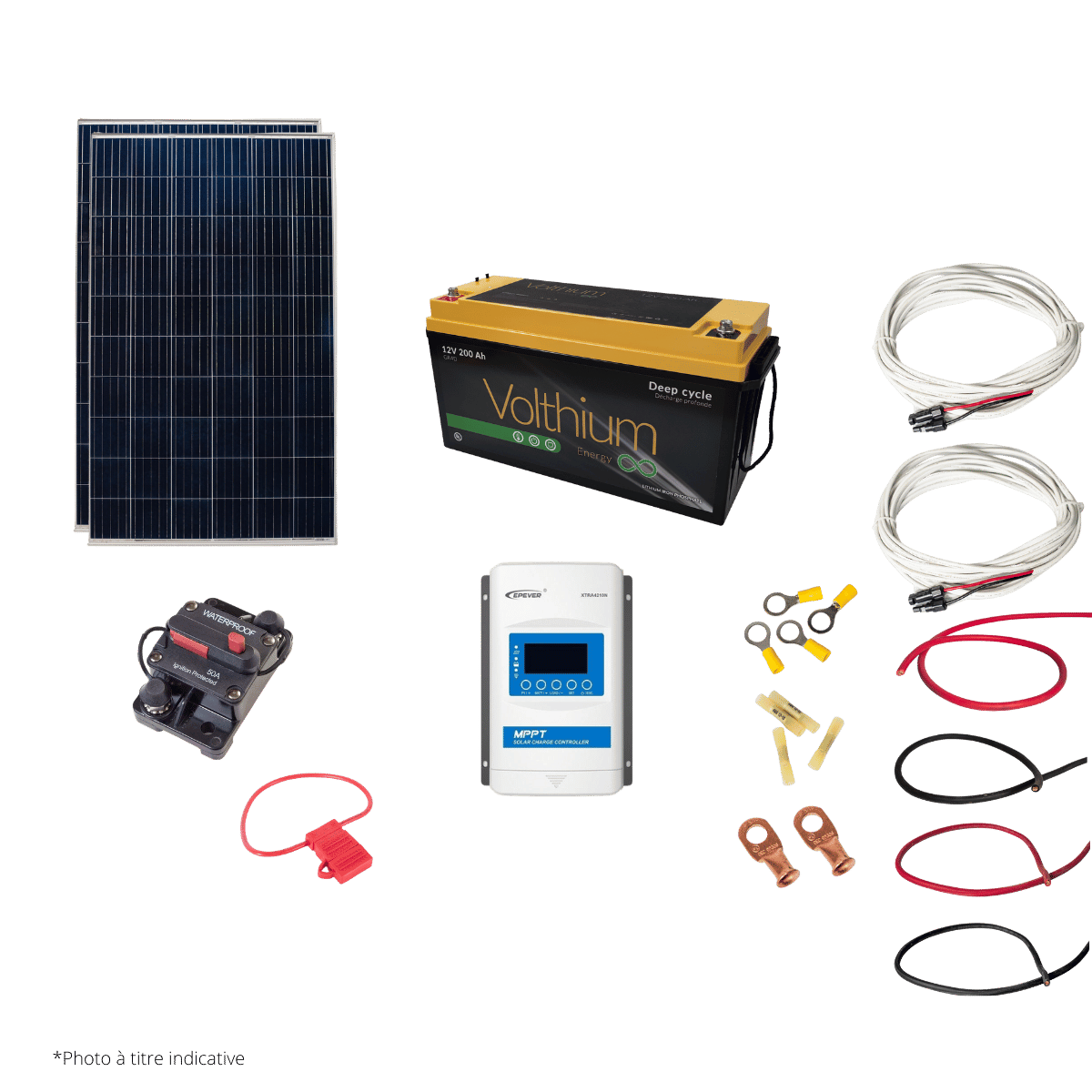Certains appareils électroniques nécessitent du courant alternatif (120V). Dans ce cas, vous devrez vous équiper d’un onduleur. Étant donné la puissance de ce kit, nous vous conseillons d’opter pour un onduleur sinus modifié d’une puissance de 2300W (ou de 2000W pour un sinus pur) afin de pouvoir profiter pleinement de ses capacités.