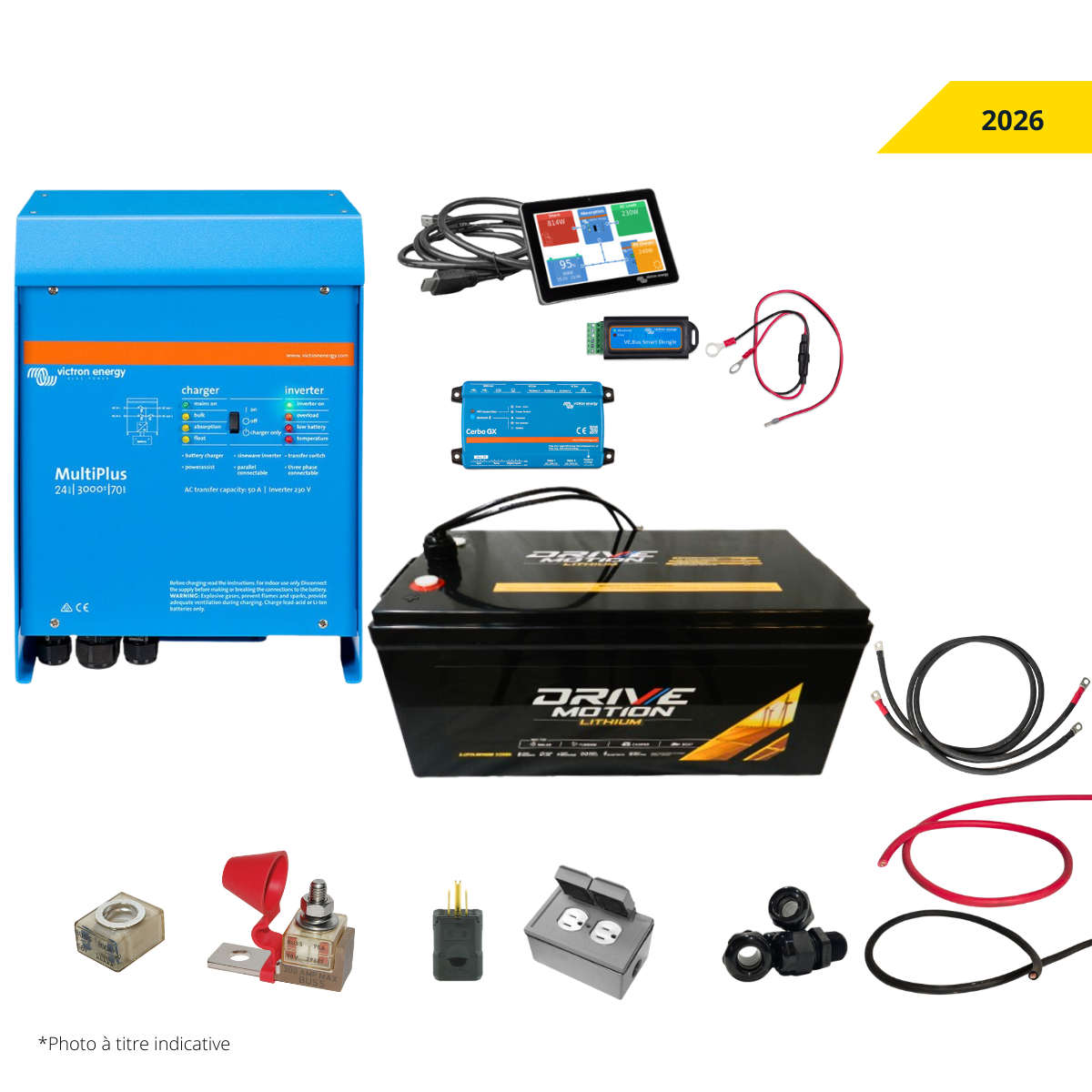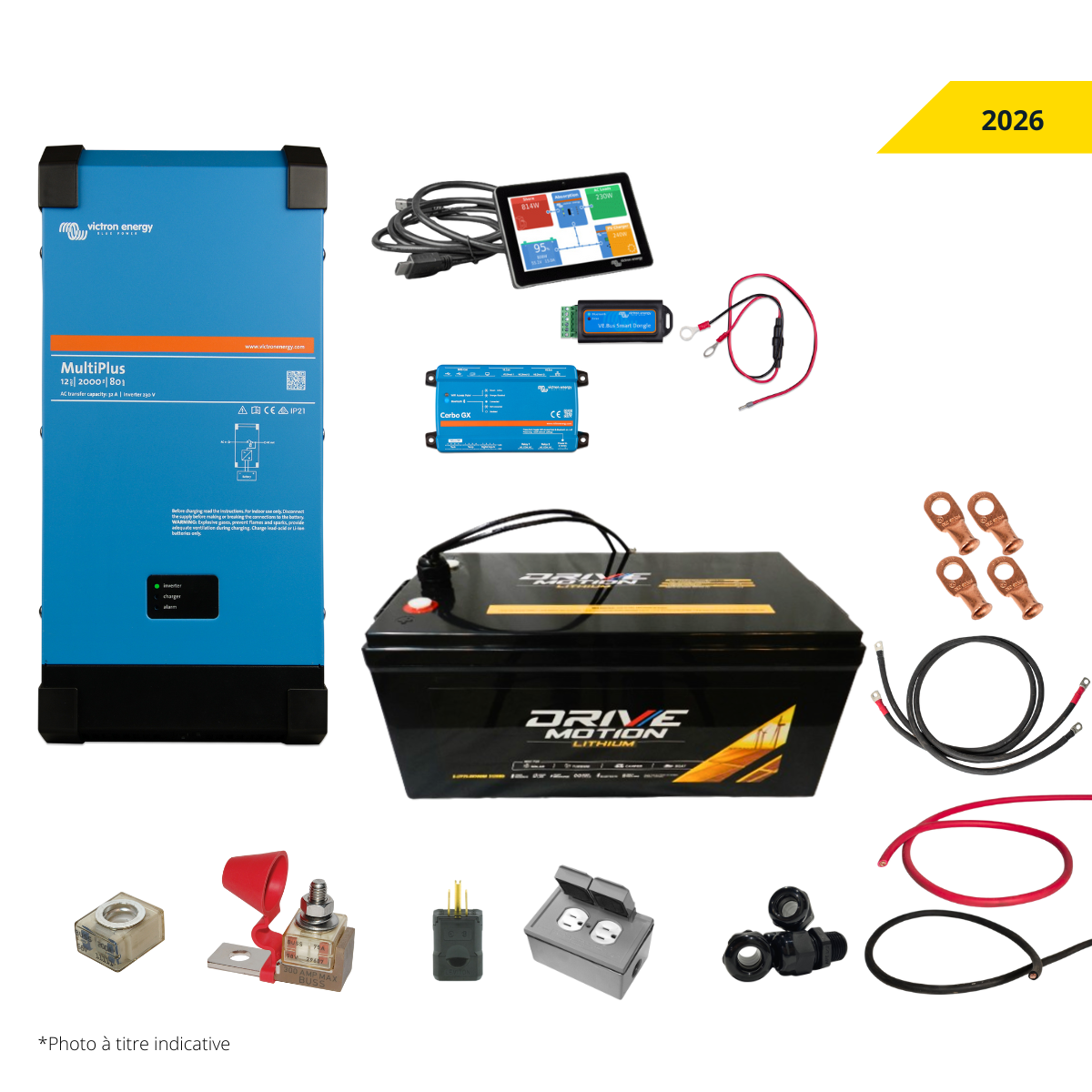 L’ensemble comprend un onduleur qui peut aussi agir comme chargeur, lorsque jumelé à une source d'énergie auxiliaire telle une génératrice.